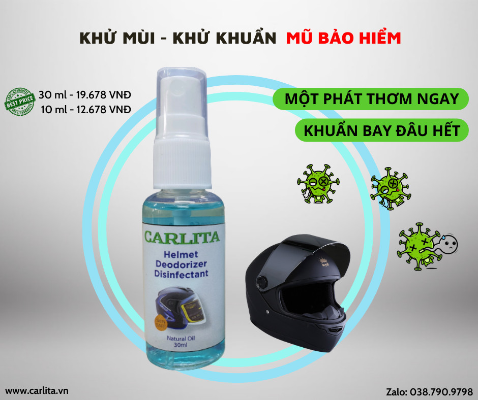 Mô tả chi tiết: Xịt khử mùi mũ bảo hiểm Carlita, làm sạch, khử mùi, diệt khuẩn hàng chính hãng. Xịt làm sạch mũ bảo hiểm Carlita chứa tinh dầu thiên nhiên, giúp làm sạch và tạo mùi tươi mát cho mũ bảo hiểm đội lâu ngày, nhanh chóng loại bỏ mùi khó chịu, loại bỏ nấm, ngứa. Sản phẩm rất dễ sử dụng, chỉ cần xịt vào vật dụng bạn muốn làm sạch và dùng ngay.